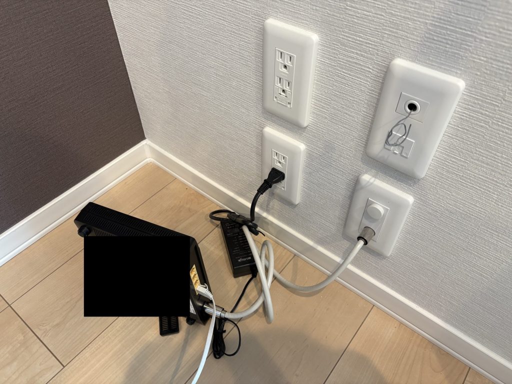 新築の物件なのに光回線ではなく、同軸ケーブルで部屋まで来ています。CATVとセットのネットですので、おまけのようなものなのでしょう。同軸ケーブルというよりはテレビ線といった方が伝わりやすいかもしれません。