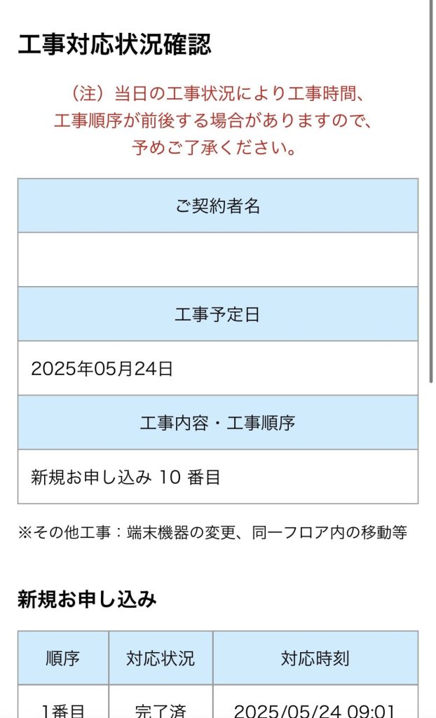- 2025年4月12日 ドコモ光サービスセンターへ工事日決定の連絡
