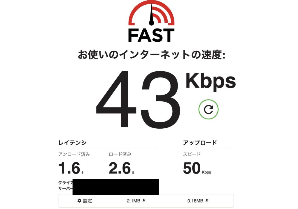 どれくらい遅かったのかを具体的な数値でいうと、調子のよい時でダウンロード 90Mbps/アップロード3Mbps程度、通常時はダウンロード30 ~ 40 Mbps/アップロード1 ~ 3 Mbps程度、調子の悪い時はアップロード/ダウンロード共に数十kbpsでした。