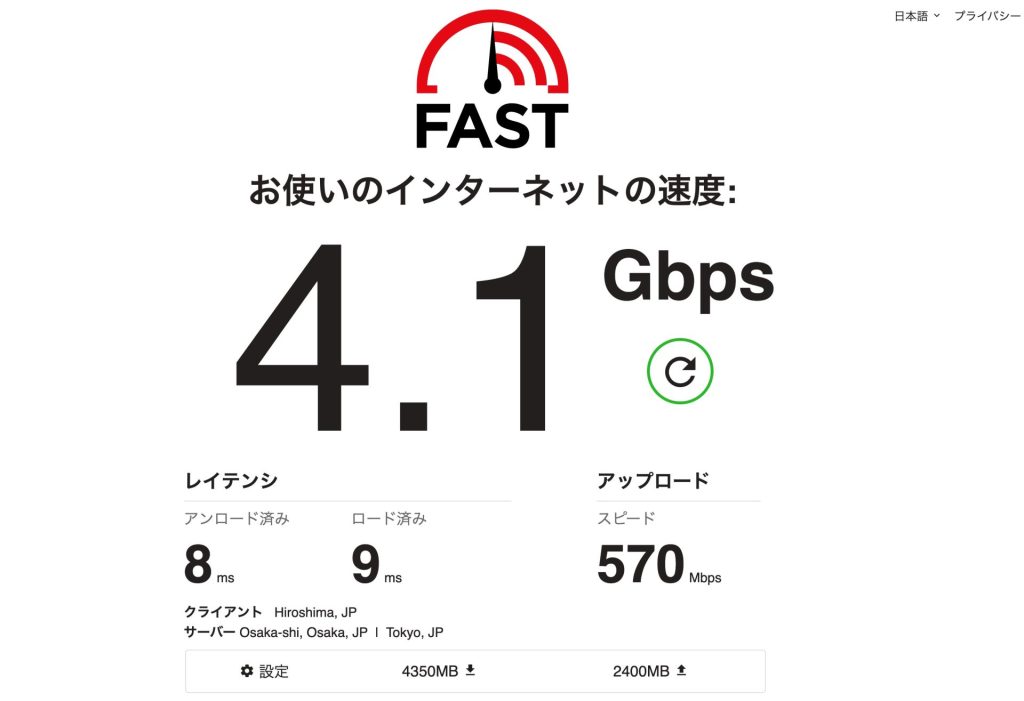 おおよその平均ですが、ダウンロードが 3Gbps、アップロードは 600Mbpsくらいです。測定するサイトによっても若干変わるとは思いますが、fast.comであればダウンロードは最大でも4.5Gbpsくらいでした。理論値ぎりぎりとまでは行きませんが、使い切れないレベルの速度ですね。
